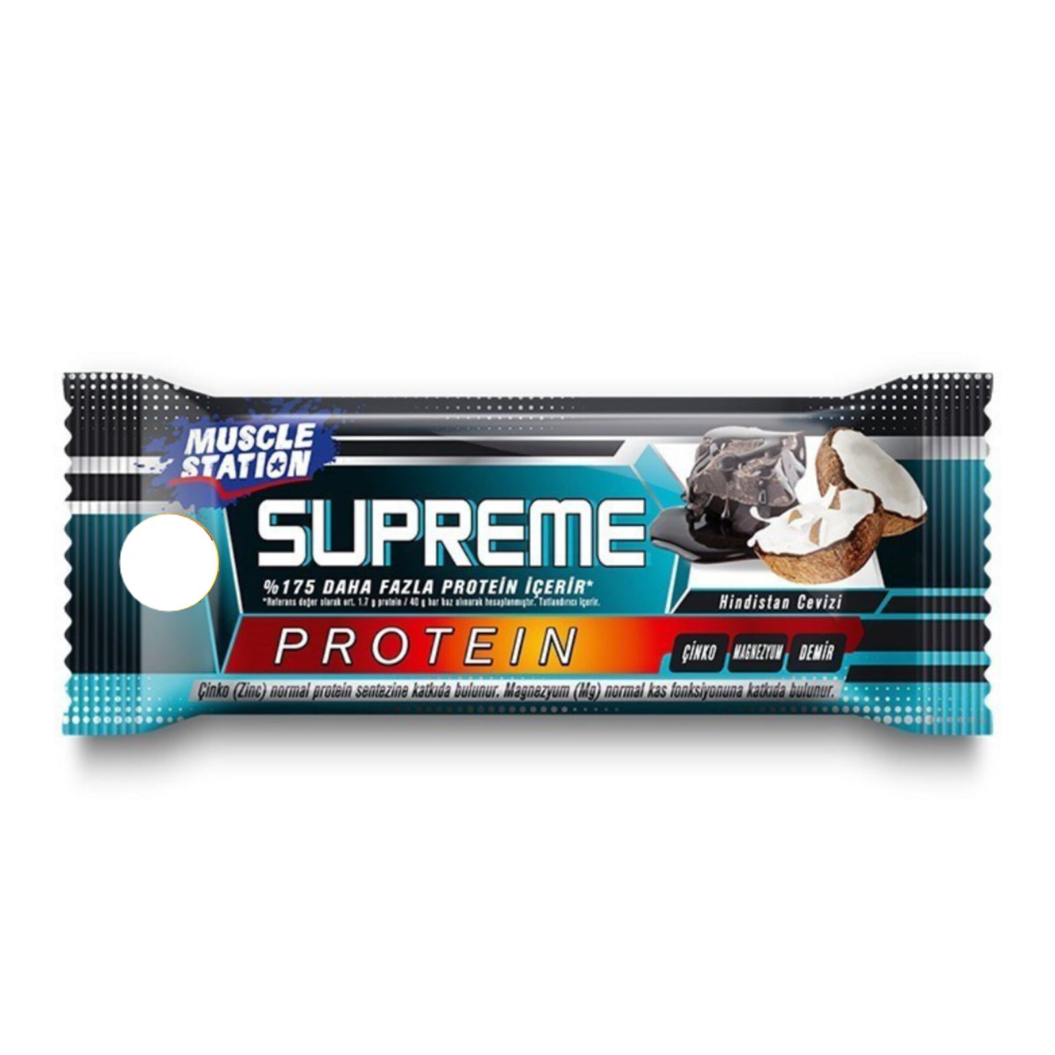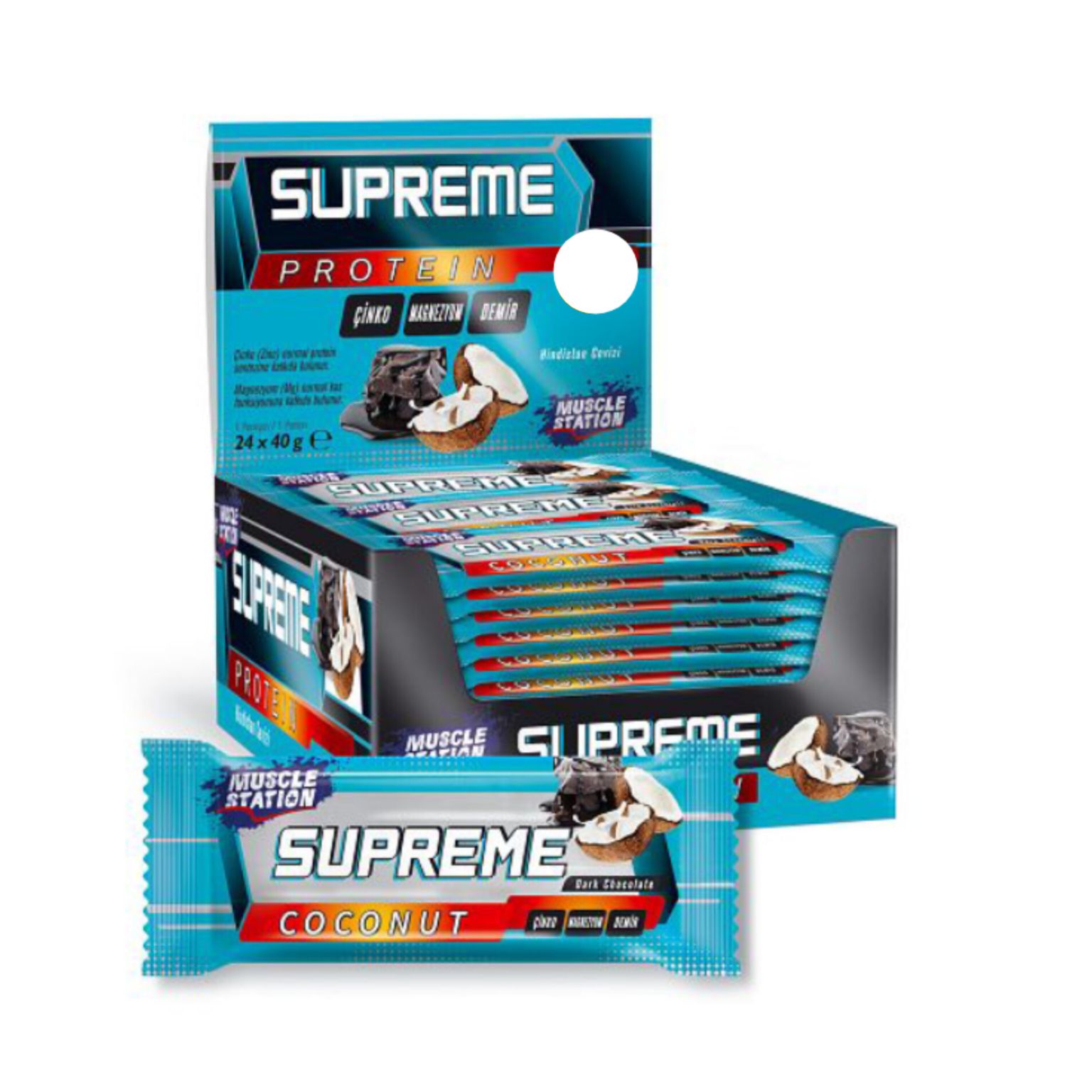 پروتئین بار ماسل استیشن سوپریم با مغز نارگیل و شکلات تلخ باکس 24 عددی supreme muscle station